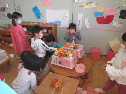 日々いろいろなごっこ遊びが展開されている3歳児もも組の姿です。