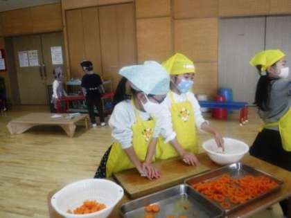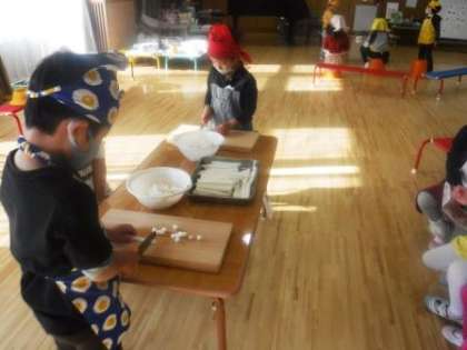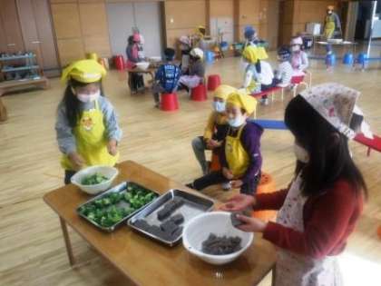 ゆり組は,今年度初めて包丁や型抜きを使い,調理体験をしました。安全に使う方法をしっかりと聞き,静かに集中して食材を切ったり,友達の様子を見守ったりしていました。また,切る以外にも,ブロッコリーやこんにゃくを手で小さくちぎりました。