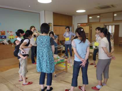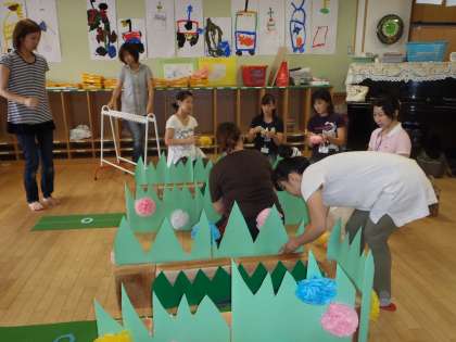各遊びについていろいろ考えて準備を進めていただいていましたが,実際に配置するのは初めてです。置いては確かめ,そしてまた置きなおしたりしていただきました。