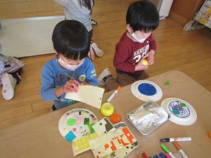 3歳児は紙皿を使ったくるくるとまわる凧です。