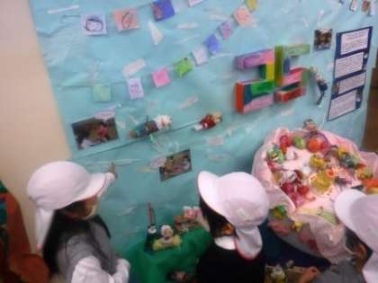 自分の作品を見つけたり,友達の作品を知らせたり,友達と一緒に見て楽しんでいました。また,他の園の作品にも興味津々な子どもたちは,「綺麗な色やな」「面白い!」と感じたことを言葉にしていました。