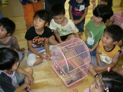 4羽のうち,1羽は3歳児たんぽぽ組のお部屋で飼っています。たんぽぽ組では赤ちゃんウサギを「たんぽぽ組のウサギやし,たんぽぽちゃんにしよう」ということになって,“たんぽぽちゃん”と呼ばれています。