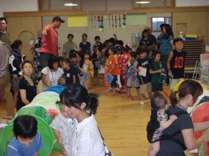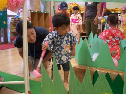 子どもたちはもちろん,お母さんやお父さん,先生たちもゆかたに着せ替えていただき,しずしずと…とはいきませんでしたが,夕涼み会の情緒を楽しませていただきました。