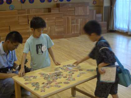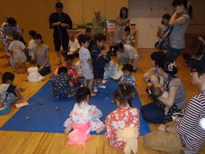 2階のお遊戯室やホールでは,みつばの森・幼稚園運営協議会による企画・運営の昔遊びが催されました。