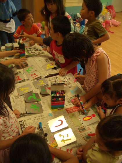 昨日きれいに色を塗った水車の羽に,今日は5歳児ゆり組がメッセージを書きました。