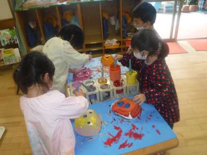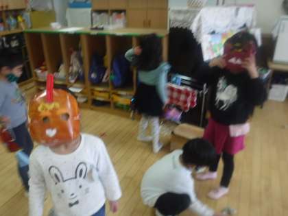 節分に向けて,鬼のお面をつくりました。「おなかのなかにおにがいる」というお話を読み,自分のお腹の中にいる鬼に出ていってもらおうと,自分のお腹にいるかもしれない鬼をつくりました。泣き虫鬼や怒りんぼ鬼,忘れんぼ鬼などいろいろな鬼がいると考えた子どもたち。「いっぱいの角があるねん」「長いキバがついてるよ」「リボンをつけた優しい鬼なの」と思い思いに鬼づくりを楽しんでいました。