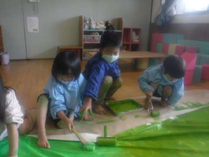 今日はみんなで”むしゃむしゃのもり”をつくろうね,と絵の具遊びを楽しみました。