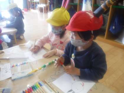 その後,とても素敵なプレゼントをくれた鬼の子たちにお礼の気持ちをこめて「絵手紙」をかきました。なんともかわいい鬼の子たちの絵手紙。見に来てくれるといいね。
