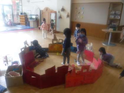 など鬼の子たちの様々な希望に合わせて先生が段ボールを切りました。