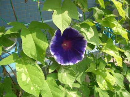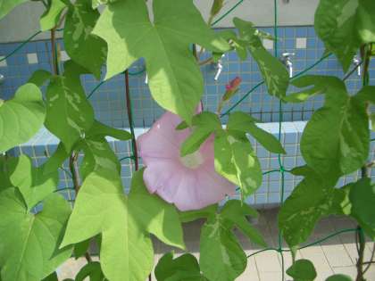 ゆり組とばら組の前にしつらえた緑のカーテンの朝顔に花が咲きました。