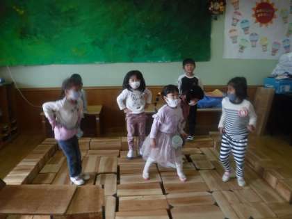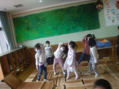 10匹のかえるのダンスがすっかりお気に入りのばら組の子どもたち。自分たちで曲をかけて友達と楽しく踊っています。踊ると自然といい笑顔に・・・