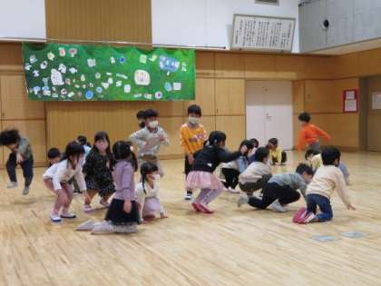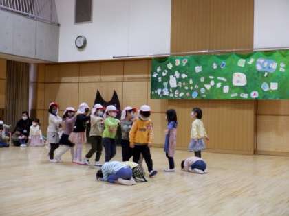 4歳児ばら組の劇遊びは「10ぴきのかえる」のお話からです。