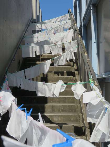 今日は暑いくらいの良い天気です。幼稚園の外階段に,真っ白な洗濯物が,気持ち良くなびいています。これを使って子どもたちは素敵なものを作ります!どんなふうに仕上がるか,お楽しみに!
