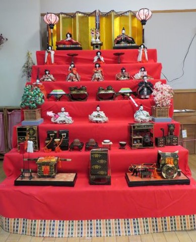 段飾りのお雛様(写真中)と,親王飾り(写真下)があります。写真には紹介していませんが,立ち雛の飾りもあります。親王飾りの背景にうつっている紅白の飾りのついた柳は「もちばな」です。地域の方にいただいたので,一緒に飾っています。