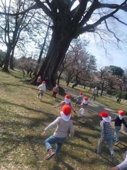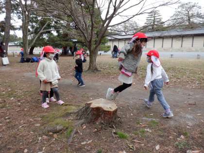 お弁当を食べたあとは,切り株をジャンプして遊んだり,だるまさんがころんだをしたり,木の実拾いを楽しんだり,好きな遊びを楽しみました。