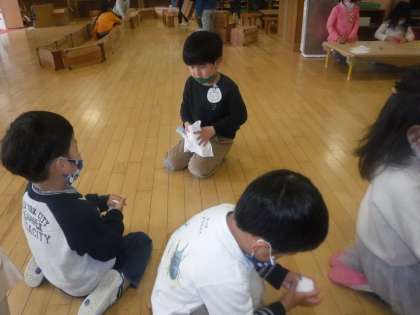 朝から子どもたちは,おふねの船長の言う”あるもの”探しに夢中です。「ここかな?」とカーテンの後ろを探したり,おままごとの引出しを開けたりしては「ないな〜」「どこやろ?」と探していました。他のクラスが見つけたことを聞くと,「ままごとのかごの中に入ってたって!ままごとのところもう一回探そう」と自分たちなりに考えていました。あるものの袋は積み木の中から見つかり,みんなで開けると真っ白なハンカチが入っていて,「じぶんだけのきれいないろにしよう」というメッセージが入っていました。