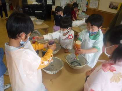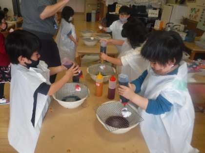少しずつ色がつくのが面白く「わぁ,ピンクになった!」「次は紫!」など染めることを楽しんでいました。