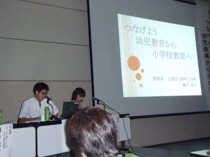 今度は,前みつば幼稚園の教諭で,現在新町小学校の教諭をしている先生が「つなげよう,幼児教育から小学校教育へ」のテーマで分科会で発表しました。