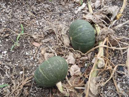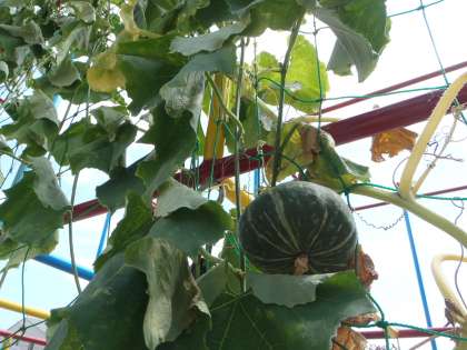 でも畑にも緑のカーテンのところにも,カボチャがいくつかできています。ちょっと小さめのカボチャ(「ほっこり姫」とか「坊ちゃんカボチャ」とかいう種類のカボチャです)です。