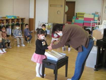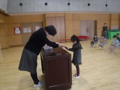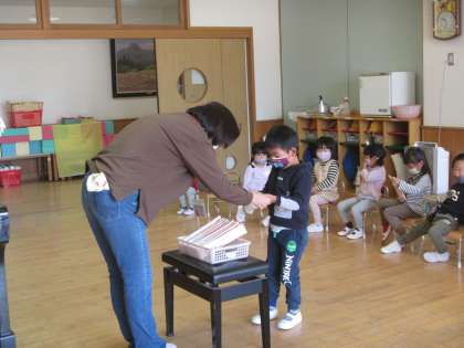 進級への期待に胸を膨らませる,もも組・たんぽぽ組・ばら組の子どもたち。園長先生から一年間いっぱい遊んで心も体も大きくなったお祝いに,進級記念品をいただきました。ゆり組さんの修了式のお稽古を見せてもらっていた子どもたちは,ゆり組さんの真似っこをしながら,記念品を受け取りました。一人ひとり名前を呼ばれると元気に返事したり,少し緊張したりしている姿もありましたが,お祝いの品を手に取り,上手にお辞儀していました。年長さんの姿をよく見ていたのだなと感心しました。席についてほっとするとにっこりいい笑顔!何が入っているのかとても楽しみにしている様子がありました。