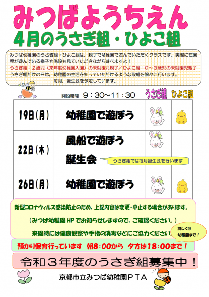 みつば幼稚園の子育て支援事業,教育相談《うさぎ組・ひよこ組》の4月の案内です。