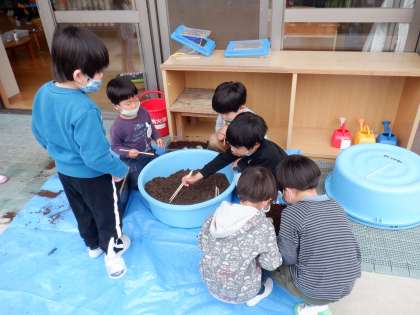 幼稚園で飼育しているカブトムシの幼虫のマットもずいぶん汚れてきていたので新しいものに入れ替えました。