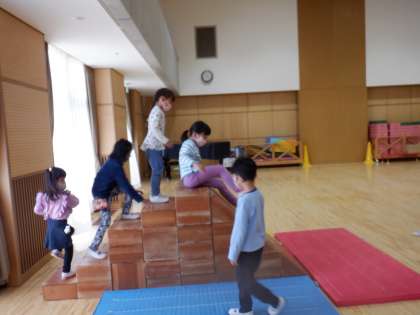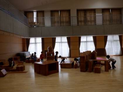 滑り台のようなものをつくっているときの様子を見ていると「ここに四角のやつ?」「三角はあと何個いる?」など形や大きさを考えながら遊んでいます。遊びの中で図形に対する感覚も育っていっているのだと感じました。