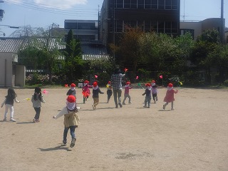 広場で思い切り走って「見て!先生,めっちゃ回った!」と喜んでいたり,今日は気持ちいい風が吹いていたので,「あれ!回ってる」「止まった」と自然に回る風車の様子を見ていたりする姿がありました。