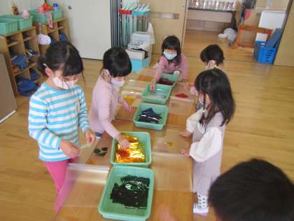 年長ゆり組は自分たちで風車の土台になる用紙からつくってみることにしました。