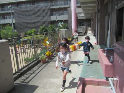 ベランダを思いきり走り,キラキラ光る風車に満面の笑顔でした。
