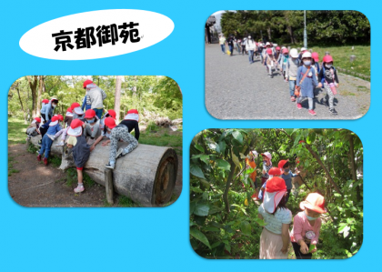 今日は4,5歳児で京都御苑に行きました。お天気にも恵まれ,絶好の遠足日和となりました。今日遊んだ,母と子の森には,大きな丸太や,切り株がたくさんあり,それらを滑り台や船に見立てて遊んでいました。また,木が生い茂った迷路のような場所では,「探検だ!」と列になって中に進み,草花や虫たちを探してみたり,かくれんぼや追いかけっこを楽しんだり,とクラス・学年の垣根を越えて,遊ぶ姿が見られました。