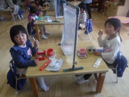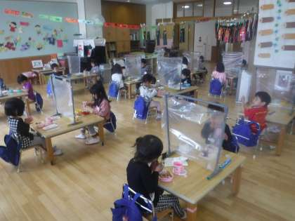 3歳児もも組の子どもたちは初めてのお弁当でした。朝から,「お弁当もってきたよ!」と嬉しそうな子どもの声。開けて見せてくれようとしている子どももいて,お弁当を楽しみにしている様子がうかがえました。遊んでいる途中も「お弁当まだ?」「早く食べたい!」とお弁当の時間を今か今かと待ちわびていました。