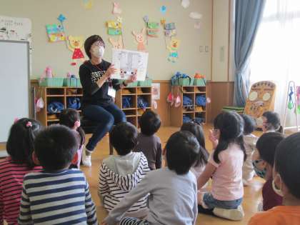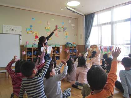 ゆり組の子どもたちは集中して話を聞き”手のひらを見せて合図する”ということも実際にやってみました。