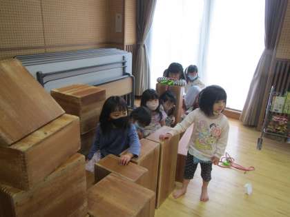 年長の子どもたちは保育室と遊戯室それから一階の玄関ホールなどを行き来しながら遊びを広げていきました。