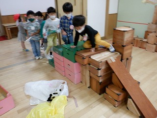積んでいる中で,橋にしようとした板状の積み木が不安定で,「どうしたらいいかな?」と子どもと先生で考えました。試行錯誤しながら積み木を重ねていくと・・・