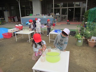 園庭では,昨日に引き続き,色水遊びを楽しんでいる姿がありました。赤色と青色の色水を混ぜて,「紫になった!」と自分で色を選んで混ぜ合わし,試している姿があります。
