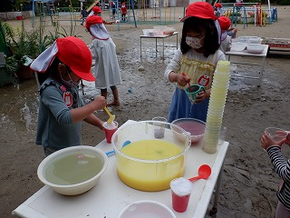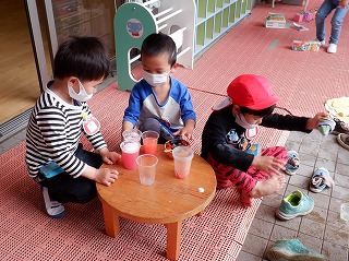 今日は,テラスで色水遊びの様子を見ていた子どもから,「ぶどうジュースください!」「にじいろジュース2つ!」と,注文が入りました。それを聞き,外で色水遊びをしていた子どもたちがジュースをつくって届けるやりとりが始まりました。