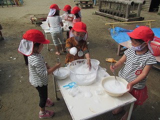 お玉を反対にしても「落ちてこない!」と泡の固さに気付いたり,「いっぱいになった!」と溢れ出しそうな泡に嬉しそうにして,またどんどんと泡を乗せたりしていました。