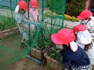 昨年度の3,4歳児が植えた玉ねぎが大きく育ったので,代表して4歳児が収穫をしました。抜いた玉ねぎの根っこ,葉をちぎることが難しかったようですが,友達や先生と「せーの!」と綱引きのように引っ張り合い,最後は紐でくくって干すところまでできました。