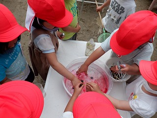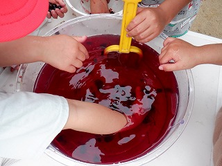 また色水遊びでは,たくさんできていたカワヅザクラの実を使って遊びました。「さくらんぼ?」と指で潰してみると,真っ赤な果汁が!「りんごみたい!」「魔女のスープ!」とイメージを膨らませながら,どんどん水と混ぜていきました。たくさん実を潰し,真っ赤に染まった手を見て,「なんか血みたい!」と,友達と見せ合う姿もありました。