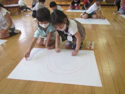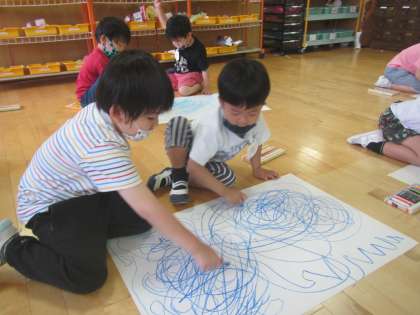 今まで「ぼくは絵かくの苦手や」と言っていたAくんが「先生,めっちゃ楽しい!もう一枚やりたい!」となんとも伸び伸びと遊んだのでした。