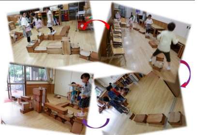 ばら組で,昨日から残しておいた積み木の迷路。続きをつくっているうちに,今日は廊下まで伸びていきました。