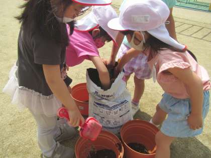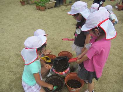 その後の写真が2枚目です。順番に土がこぼれないように互いに待ちながら,入れています。