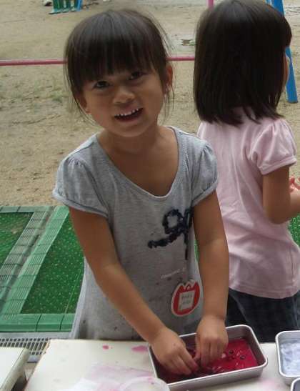 4歳児のばら組の保育室の前では,きれいな色水づくりが始まっていました。