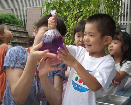 朝顔の咲き終わった花をいっぱい集め,水につけて絞るときれいな色水が出てきました。
