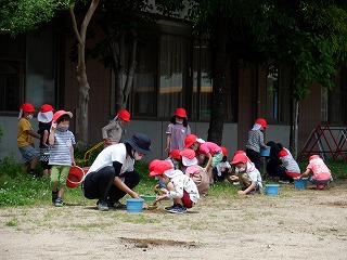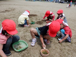 「見て!こんなにおっきいの!」「小さい草いっぱい取ったで!」と,草がズポッと抜ける快感を味わっていました。お部屋も園庭も,綺麗になるって気持ちいいね!