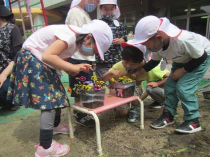 幼稚園の花壇に咲いているパンジーなどを摘みながら,「これ,きれいやし(おじいさん,おばあさんが)きっと,喜ぶと思うな」「こっちの色がいいんじゃない?」と友達と話をしていました。贈る相手のことを思いながら花を摘むって,素敵なことだなと心が温かくなりました。