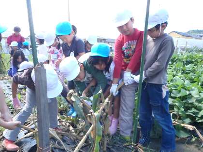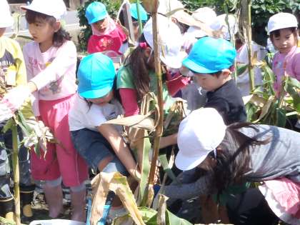 みんなでよ〜く見て,全部のポップコーンを収穫することができました。そしてポップコーンの幹をみんなで抜きました。先週末の台風の影響もあり,土が粘土状になっていて,なかなか抜くことができませんでした。でも,力を合わせて引っこ抜いていました。力いっぱい抜いて尻餅をつきそうになっている人たちもいました。