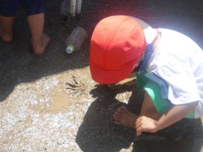 手を押し付けてみると,手形がつきました。その手形はずっと残っていてそこに水が溜まっていました。また泥んこを集めた上をペタペタたたくといい音がしました。何度もたたいていたので「いい音するね」と声をかけると,たたいて聞かせてくれました。