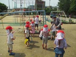 スプリンクラーから出る水に「きゃー!」と大興奮したり,ペットボトル水鉄砲で水を掛け合ったりして,プールが始まる一足先に,水の気持ち良さを味わいました。